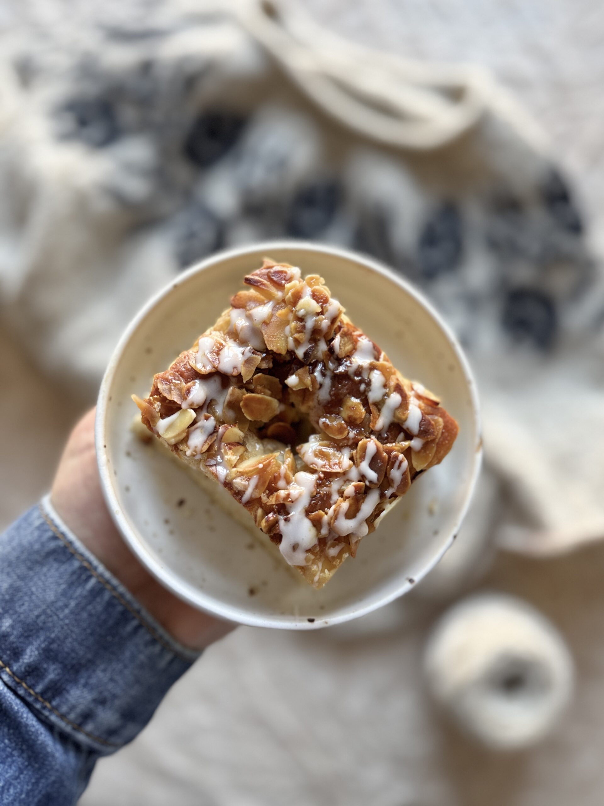 Orientiert habe ich mich an einem älteren Rezept aus der essen & trinken und noch ein paar Zutaten ergänzt, ausgetauscht und den Sahneguss hinzugefügt. Ich finde nämlich eine leichte Vanillenote und gehobelte Haselnüsse gemischt mit Mandeln als Belag besonders köstlich. Damit der Butterkuchen saftig wird, ist der Hefeteig recht weich. Wenn man mit feuchten Händen arbeitet, ist das aber kein Problem. Außerdem wird der Kuchen nach dem Backen noch mit Schlagsahne übergossen. Ein alter Trick um Kuchen saftig zu halten. Besonders gut bei Hefeteig, der ja schnell altbacken wird. Zusammen mit der Butter wird der Kuchen sehr gehaltvoll, das lohnt sich aber sehr. Man kann ja einen langen Spaziergang oder eine Sporteinheit einplanen. Oder wie ich, fleißig die Hände beim Stricken bewegen😀