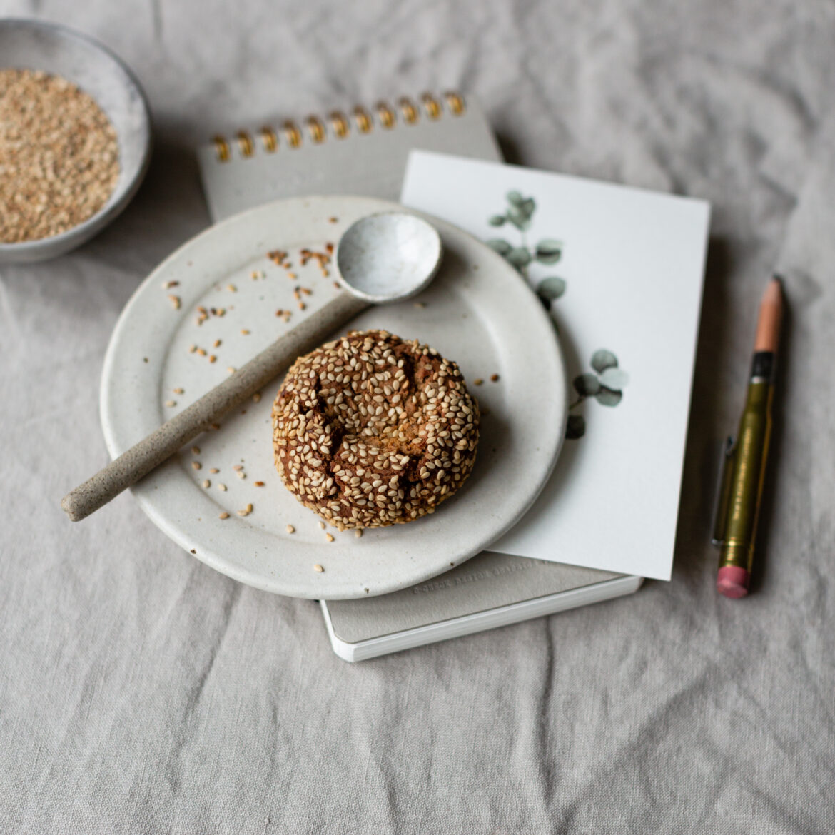 Mehl und Backpulver miteinander vermischen. In eine andere Schale Butter (oder Butterersatz) Miso, Zucker aufschlagen, dann Ei oder Eiersatz und das Vanilleextrakt hinzufügen und verrühren. Anschließend die Mehl-Backpulver Mischung hinzugeben und kurz noch einmal alles miteinander vermengen, abdecken und in den Kühlschrank stellen. Am nächsten Tag den Backofen auf 180 Grad vorheizen, das Backblech mit Backpapier auslegen und eine Schale mit den Sesamkörner bereitstellen. Jeweils ca. 45 g schwere Kugeln aus dem Teig formen und in der Schale mit den Sesamkörnern wälzen. Die Kugeln und auf das vorbereitete Backblech legen (dabei Platz lassen!) und in den Backofen schieben. Nach 6 Minuten das Backblech aus dem Backofen nehmen und einige Male auf den Küchentresen schlagen, so brechen die Cookies auf, alternativ die Cookies mit einem Holzlöffel flach drücken. Dann für weitere 4 Minuten backen und aus dem Backofen nehmen, leicht abkühlen lassen und genießen. Rezept von Simone Hawlisch <3