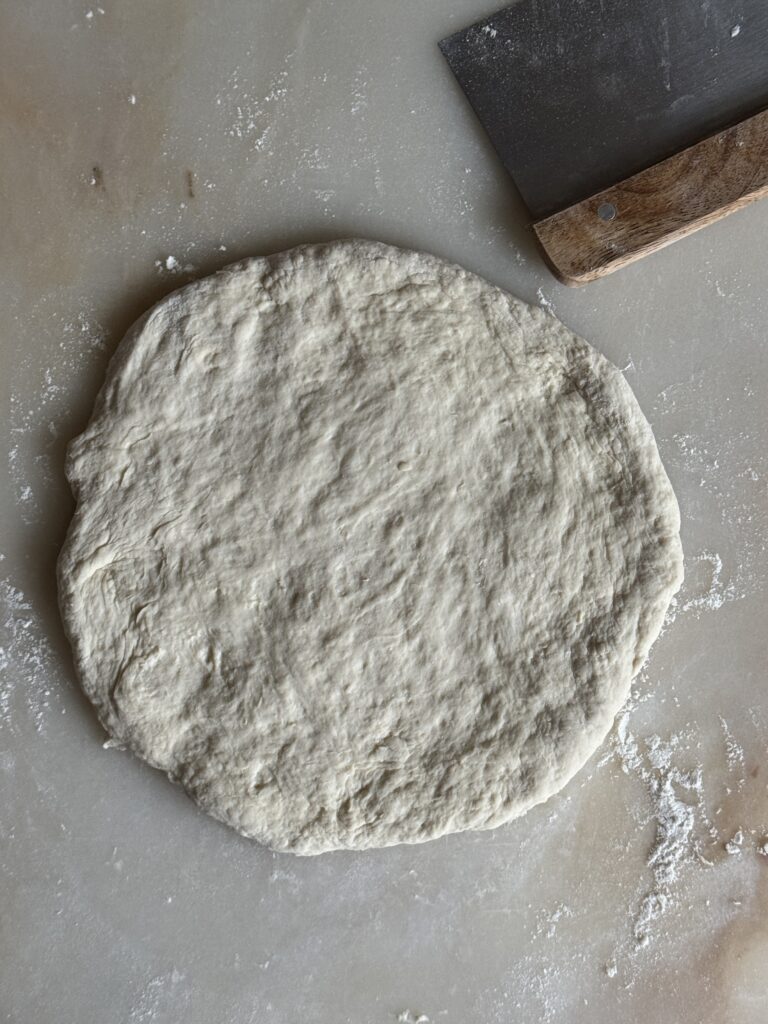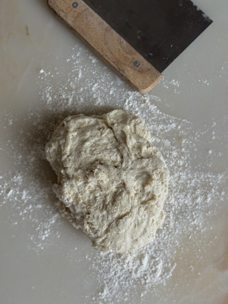 2. Die Arbeitsplatte mit Mehl bestäuben und den klebrigen Teig darauf legen. Nun kurz mit dem Mehl der Arbeitsfläche verkneten. Der Teig sollte dabei nicht zu glatt geknetet werden, sonst wird er zäh. Die Fläche nochmal mit Mehl bestäuben und den Teig zu einem etwa 20 cm großen Kreis ziehen oder ausrollen. Nun mit einem scharfen Messer den Kreis vierteln.