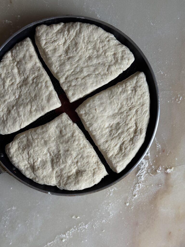 3. Eine beschichtete Pfanne (ca. ∅ 24 cm) bei mittlerer Hitze erwärmen. Die einzelnen Farl-Viertel in die Pfanne legen. Dabei darauf achten, dass sich die Schnittflächen nicht berühren.