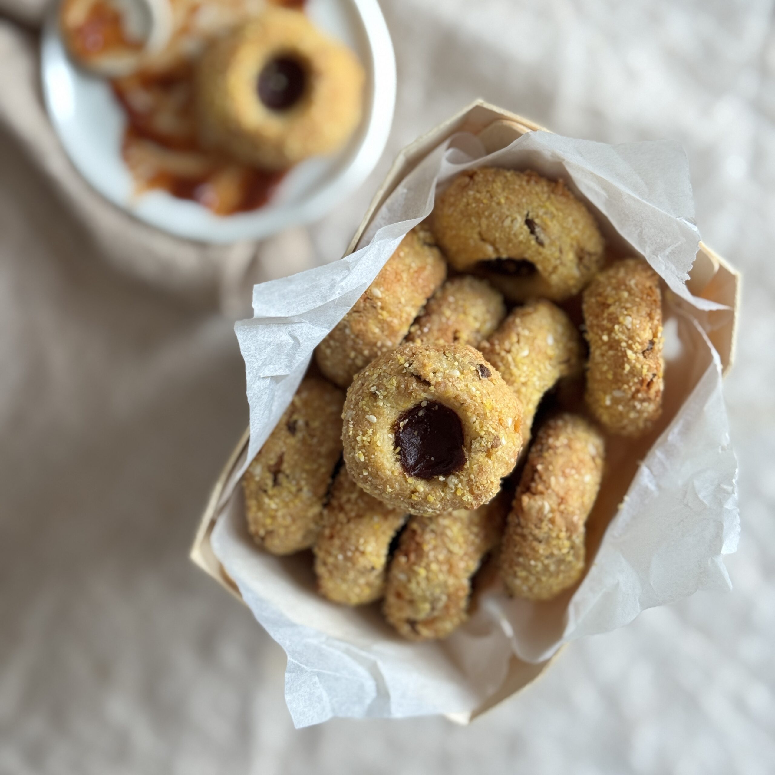 Für meine Tasse(n) Tee am Tag suche ich immer leckere Begleiter. Und ganz besonders liebe ich Kekse. Diesmal sollte es aber nicht süß sondern herzhaft sein und ich wollte Ketchup als Zutat einbauen. Der Teig ist schön würzig mit viel geriebenem Käse, Röstzwiebeln und Sesam, Polenta (Maisgrieß) gibt eine tolle gelbe Farbe. Eine Mulde im Keks bietet dann genug Platz für eine Füllung aus Ketchup und Gochujang Paste. Diese scharfe fermentierte Würzpaste kommt aus der koreanischen Küche und wird aus Klebreis-, Sojabohnenmehl und Chilis (und einigen weiteren Zutaten) hergestellt. Das gibt dem Keks noch etwas Schärfe. Hier kann jeder selbst justieren, wie scharf es denn für den eigenen Geschmack sein darf.